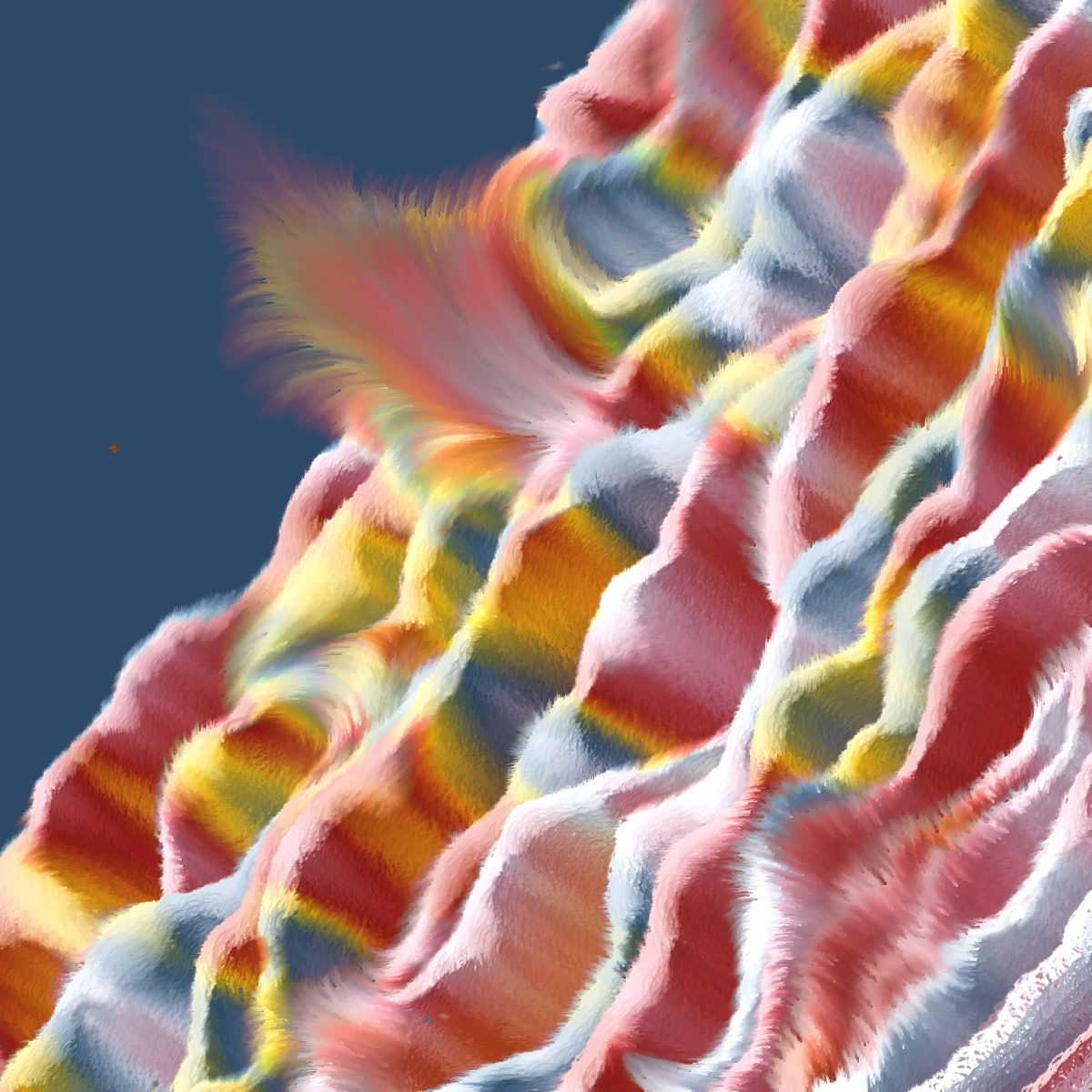 Entirely crafted through code, the waves in "Eternal Tides" transcend mere replication of oceanic movements; they are imbued with vibrant, evolving colors and patterns that echo the dynamic interplay of light upon the waters. Time plays a critical role in shaping the visual narrative, with a shader gradually altering hues to create a time-lapse effect reminiscent of polar stratospheric clouds and light dispersion in water. Each piece invites viewers to pause and observe the process that creates the artwork, where light, water, and form converge to narrate the ebb and flow of life’s experiences.
